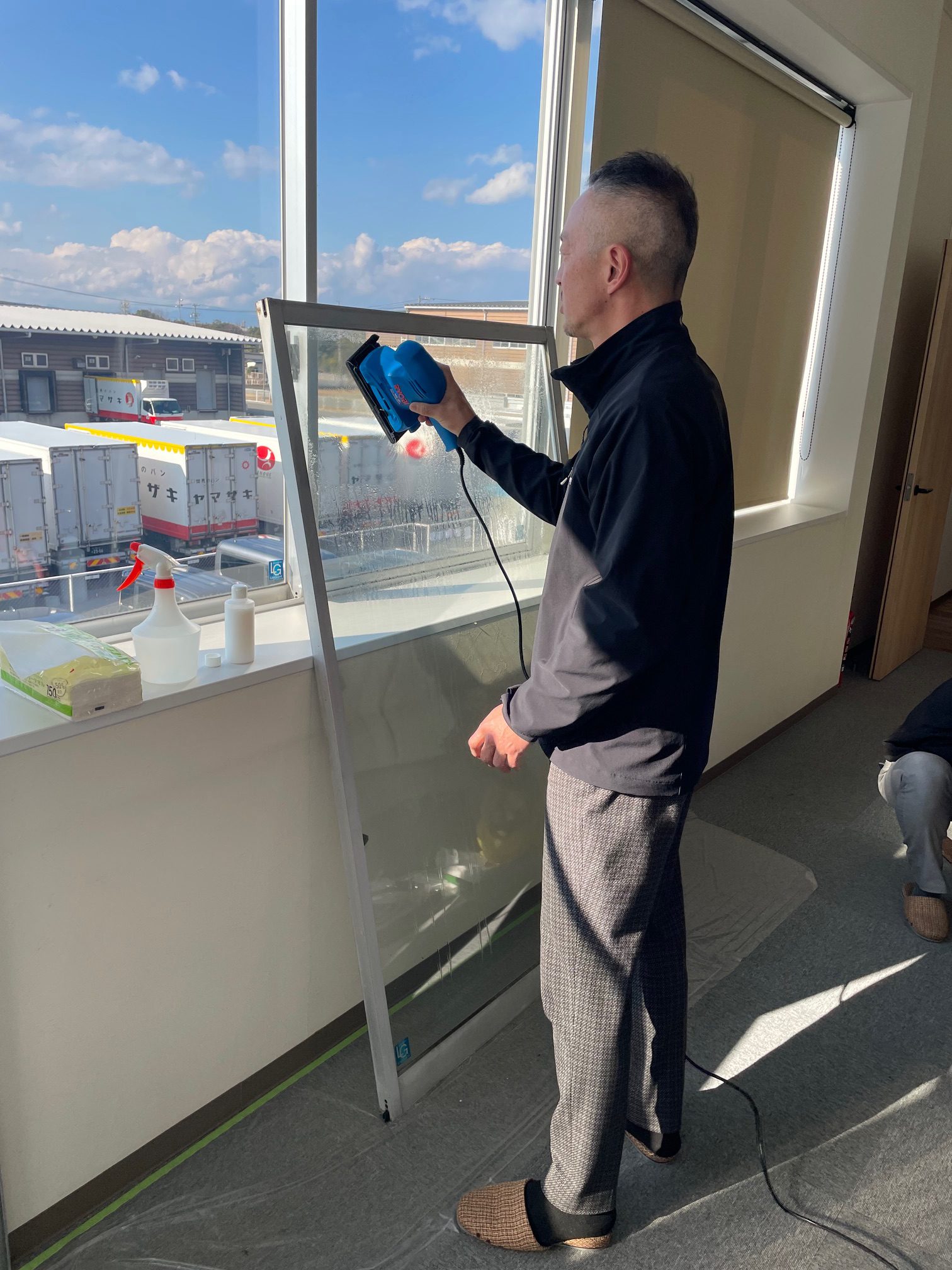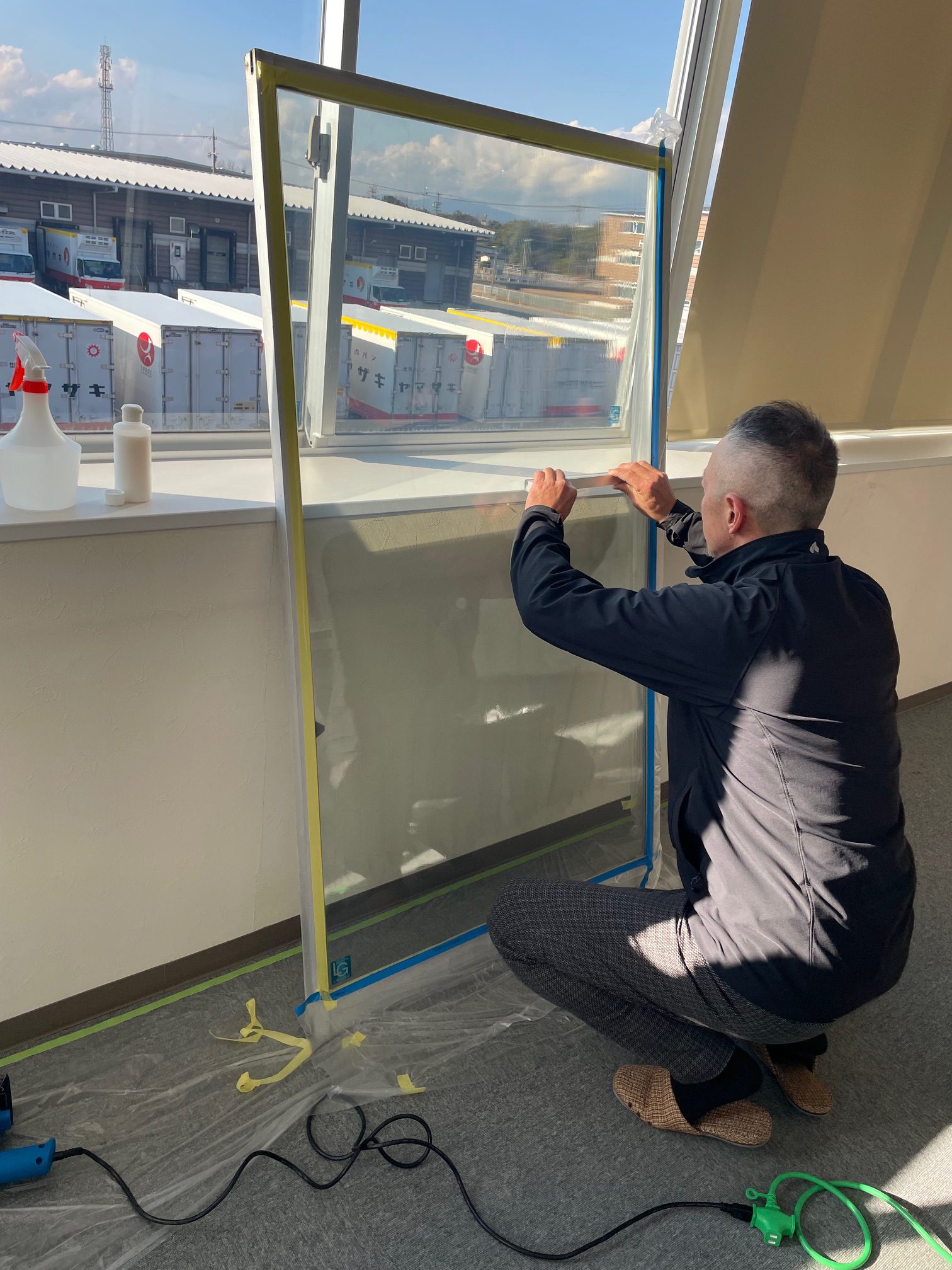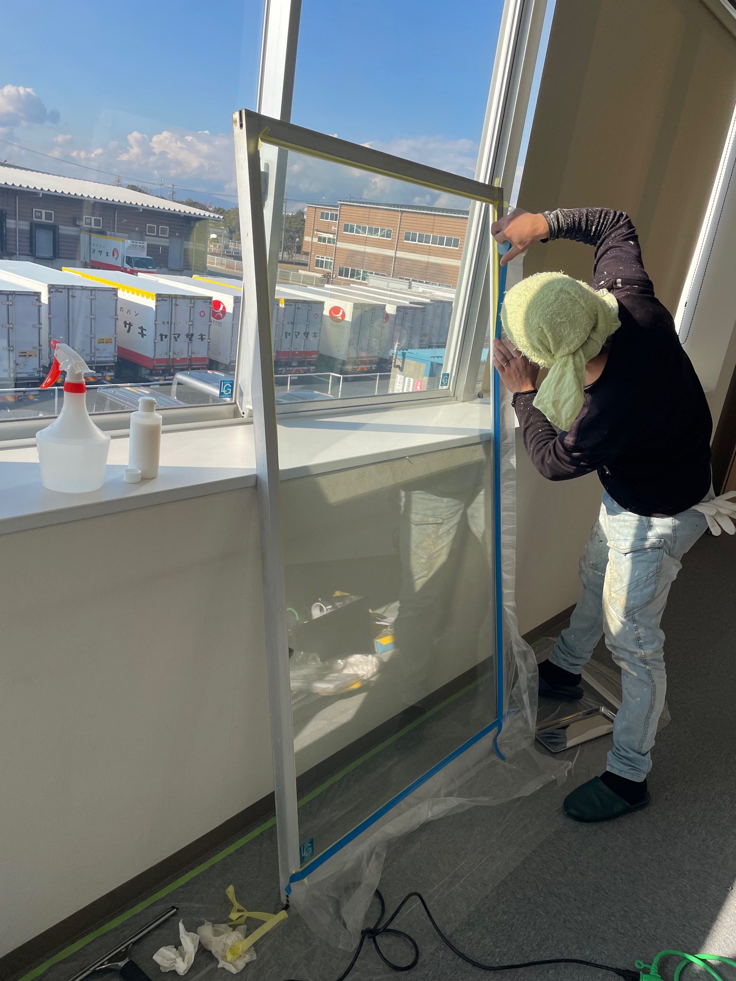 先日、弊社会議室の窓ガラスでテスト施工しました。