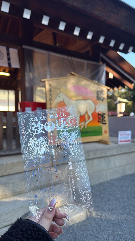 2026.02.24 大鳥大社⛩ 販売事務課の谷出です。 先日、大阪府堺市にある大鳥大社へ行ってきました。 大鳥大社は、勝運・厄除け・パワースポットとして有名です。 参拝の列は3連休初日ということもあり大行列でした。 私の目的は、先が見通せる御守と、勝みくじで透明の「強運」を引くことでした✊ おみくじの結果は・・・ 「強運」!!!!! 透明のおみくじを引くことができました👏🏻今年は強運確定なのでなんでも挑戦していきます⭐ 4月以降は仕事では部署移動があり、プライベートでも変化のある年になるので、「強運おみくじ」と「透明御守」で頑張っていきたいと思います!