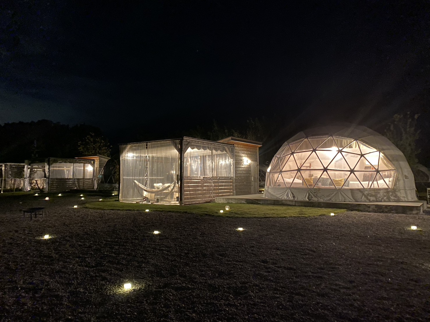 最初に印象的だったのは、リゾートにある独特なジオデシックドームのテントだ。現代的なデザインでありながら、周囲の山々の景観と完璧に調和している。このテントは、キャンプをしているような気分を味わいながらも、快適な設備が整っている。昼間は、遠くから見ると白いドーム型の屋根が緑豊かな木々と遠くの山々の中で際立って見える。夜になると、テント内の温かい照明が灯り、リゾート全体が童話の世界のように温かく幻想的な雰囲気に包まれる。