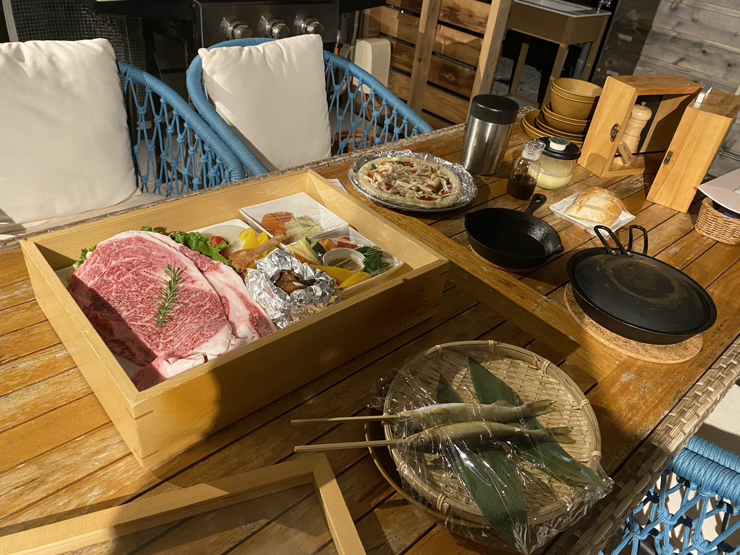 最高の体験の一つは、テントのすぐ横で楽しんだBBQディナーだ。リゾートは、美しいサシの入った高級和牛、新鮮な野菜・魚、そして様々な調味料を木のトレイいっぱいに用意してくれた。私たちは熱々の鉄板で一枚一枚お肉を焼きながら、とろけるような和牛の濃厚な旨味と香ばしい焼き野菜を堪能した。