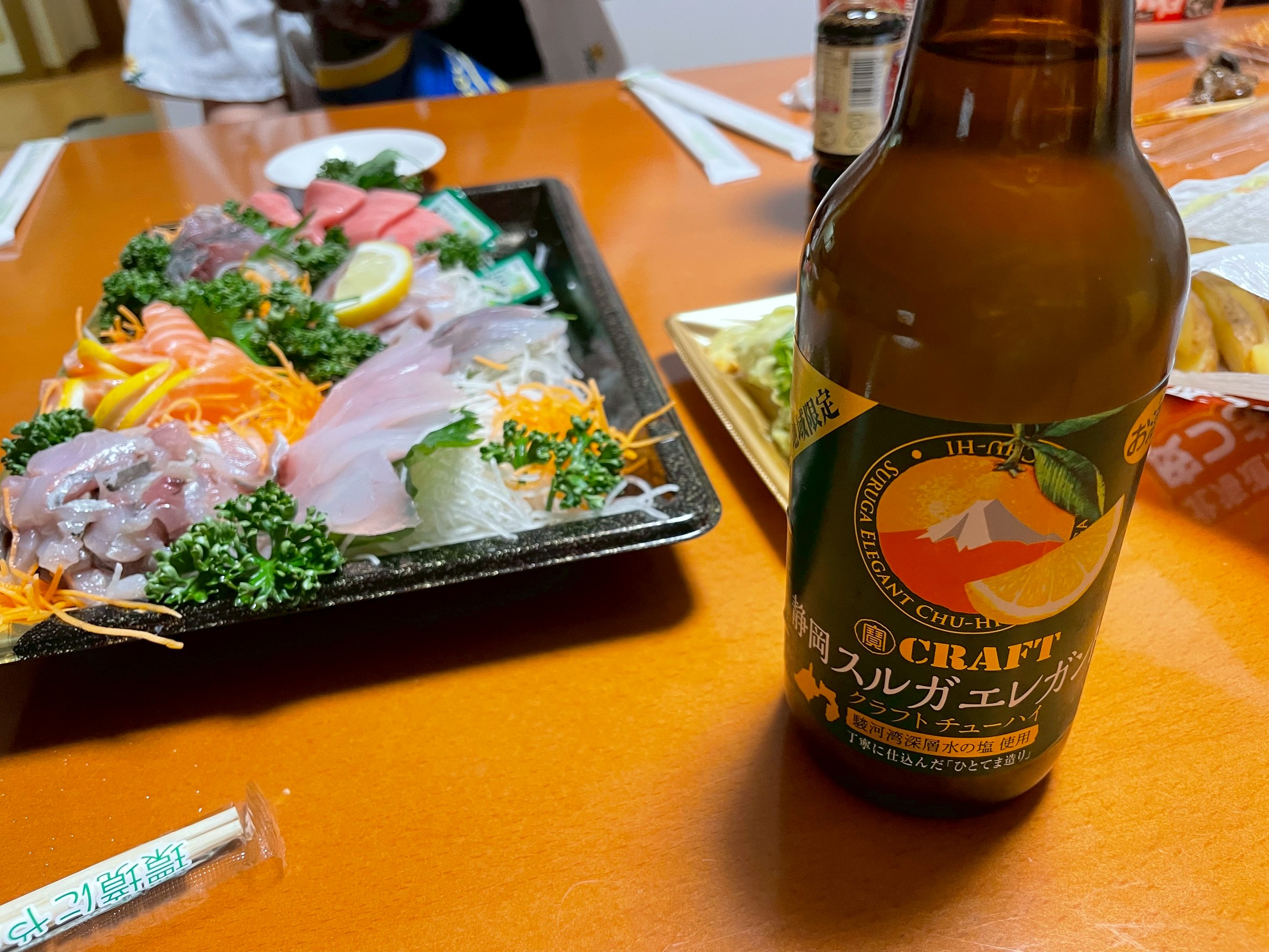 初日の夜はホテルでお刺身と地元のお酒で晩酌をし、