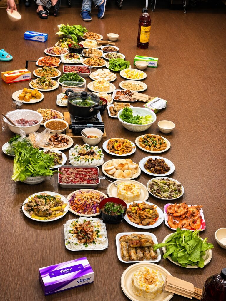 2026.04.27雑記 週末にみんなでご飯 こんにちは、工務のタンです この写真は、仕事のあと週末にみんなでベトナム料理を食べている様子です。 床にたくさんの料理が並んでいて、とてもにぎやかです。 エビや春巻き、肉、野菜など、いろいろな料理があります。 真ん中には鍋もあって、みんなで一緒に食べます。 仕事のあとに友だちと集まって、おいしいごはんを食べるのはとても楽しいです。 とてもいい時間だと思います。