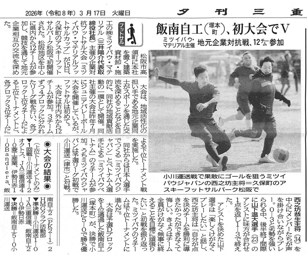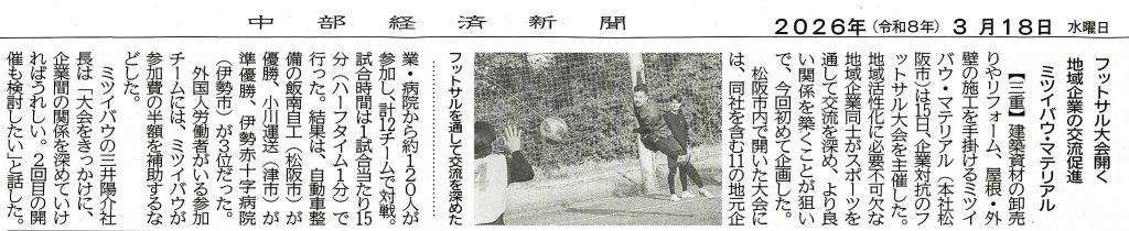 2026年3月18日付の中部経済新聞様にて、当社ミツイバウ・マテリアルが主催した「ミツイバウ・マテリアルフットサルカップ」について紹介されました。