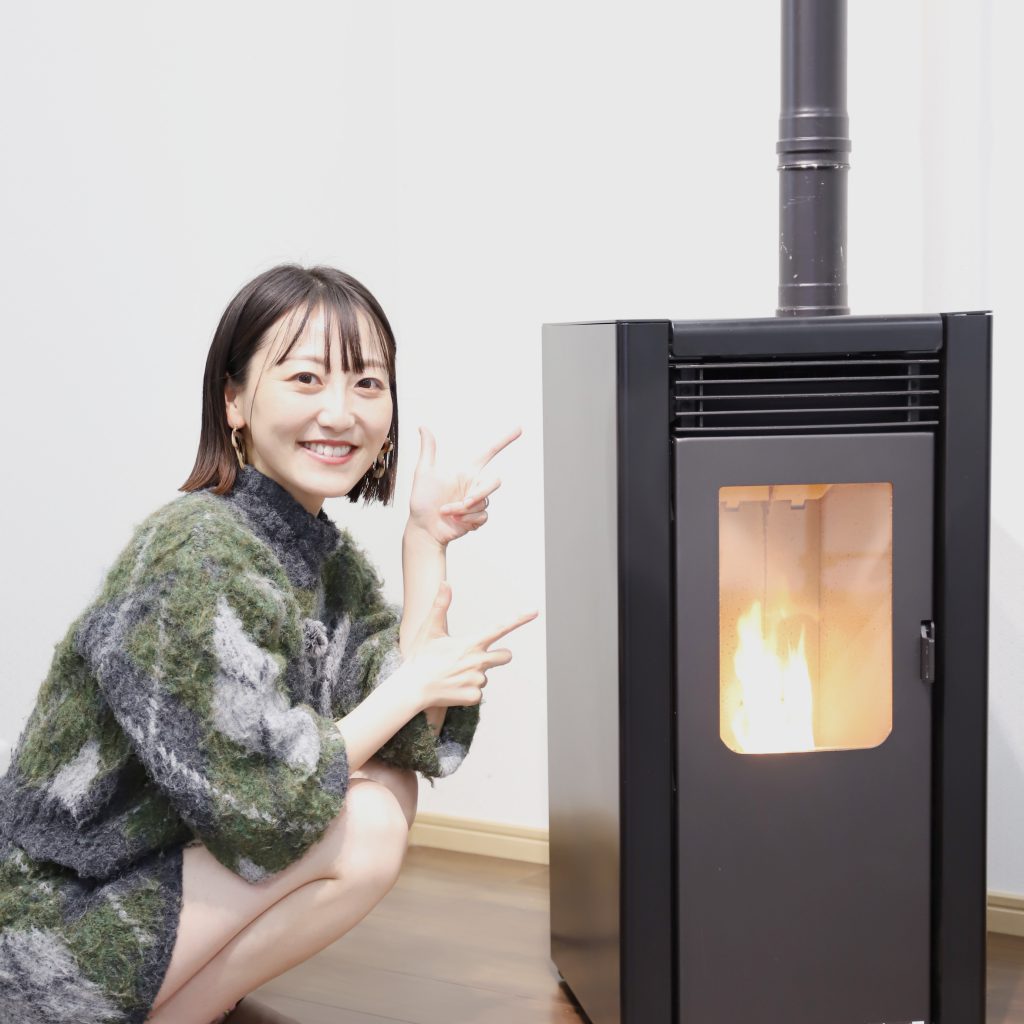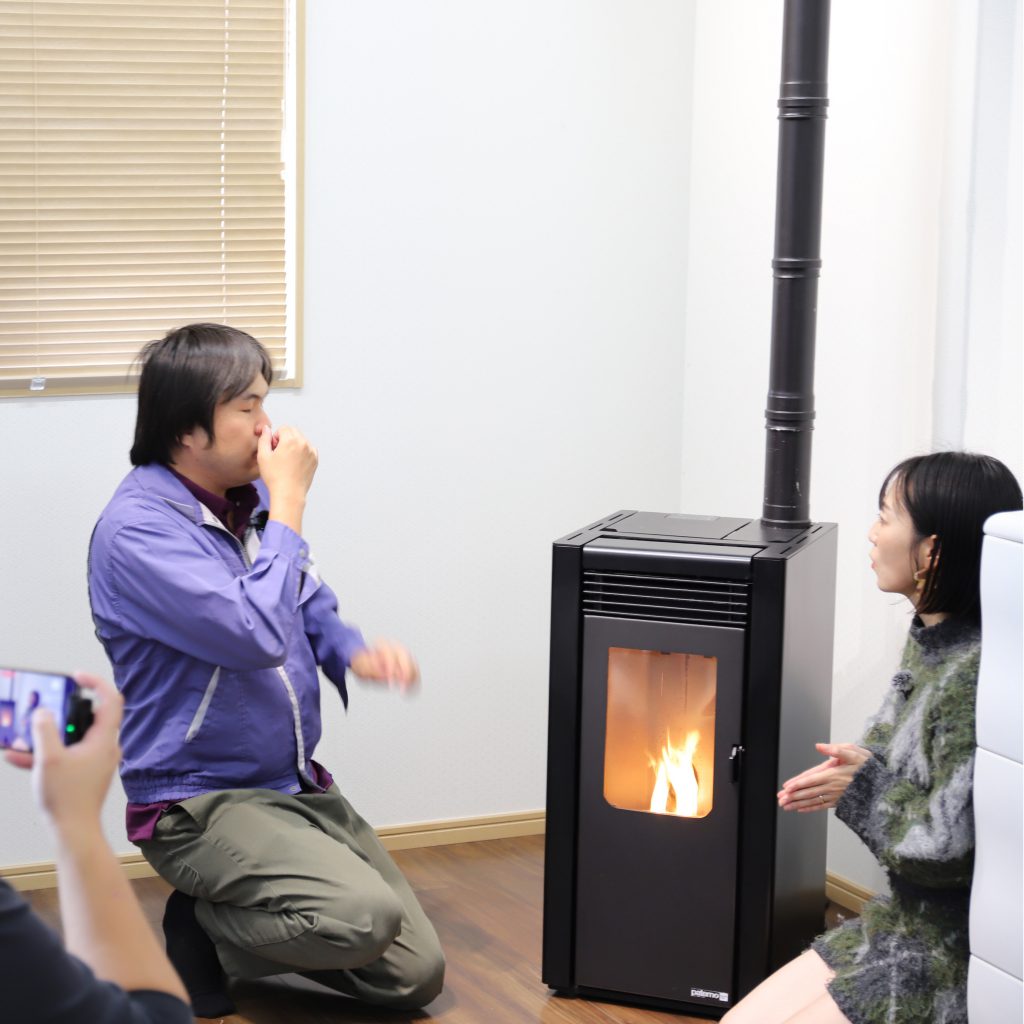 撮影では、弊社が取り扱うイタリア製ペレットストーブを、社員が津田様にご紹介する様子などが収録されました。