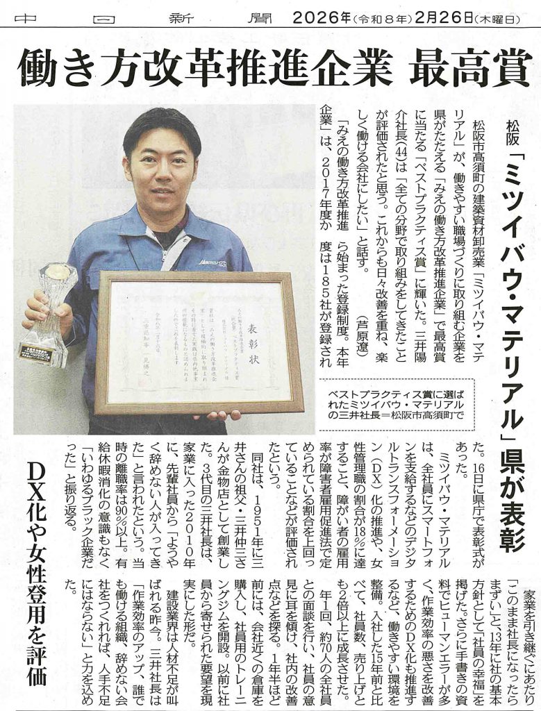 2026.02.26 『中日新聞』に「みえの働き方改革推進企業」最高賞受賞の記事が掲載されました