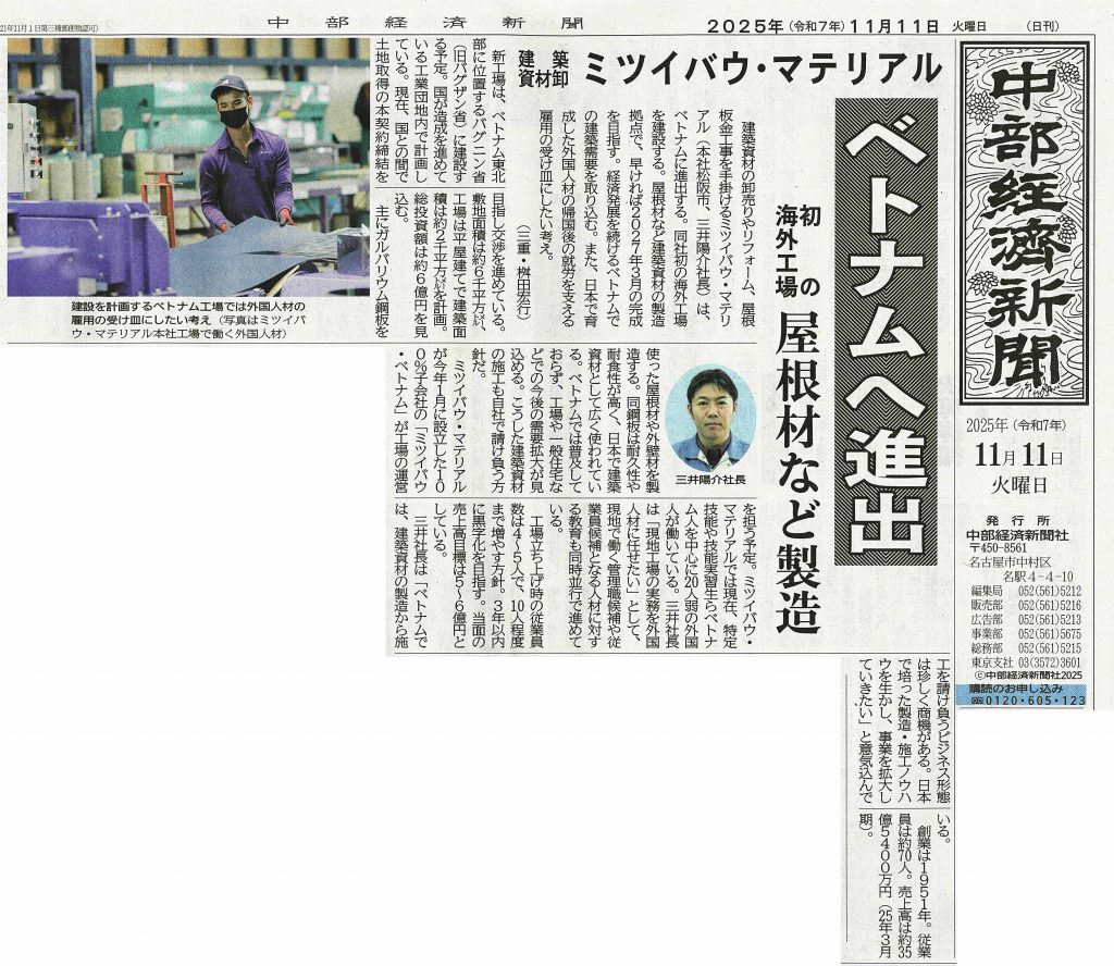 2025.11.11 『中部経済新聞』に弊社ベトナム進出の記事が掲載されました