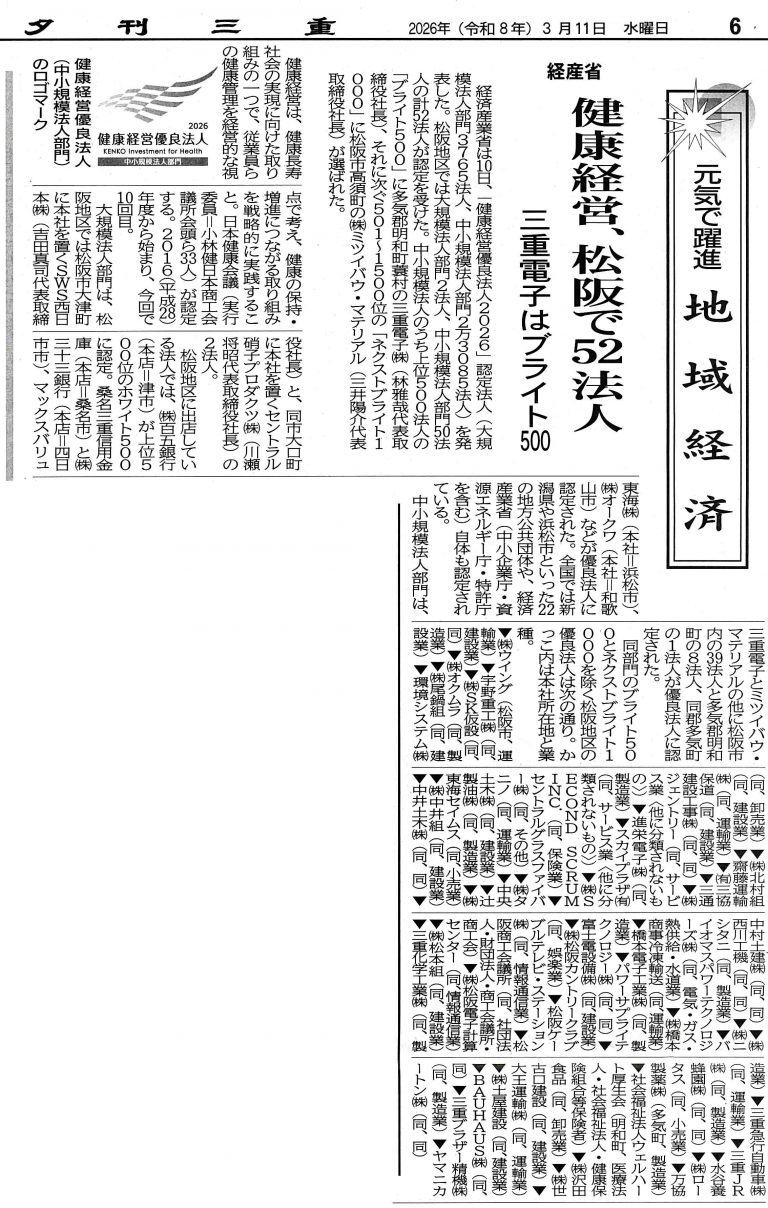 2026.03.11 『夕刊三重』に「健康経営優良法人2026」認定の記事が掲載されました