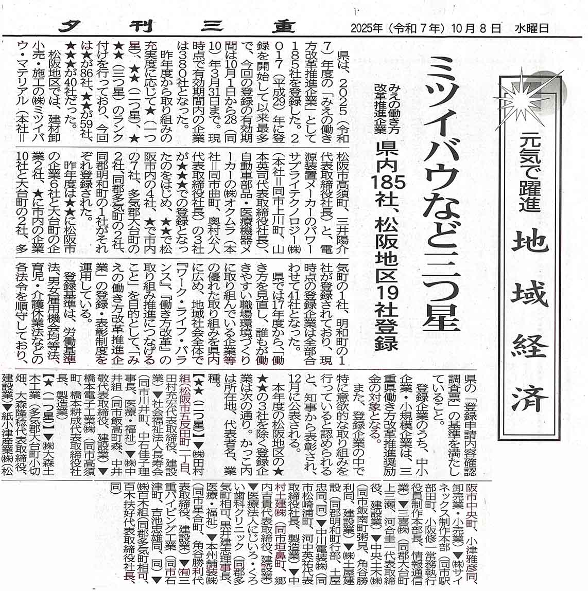 2025.10.09 『夕刊三重』に働き方改革の取り組みが掲載されました メディア掲載 2025年10月8日発行の夕刊三重新聞にて、 弊社の働き方改革への取り組みについて掲載していただきました。 ワーク・ライフ・バランスの向上を目指した弊社の施策を取り上げていただき、光栄です。 詳細は下記画像よりご覧ください。 引き続き地域社会への貢献を通じて、社会から信頼される企業を目指してまいります。