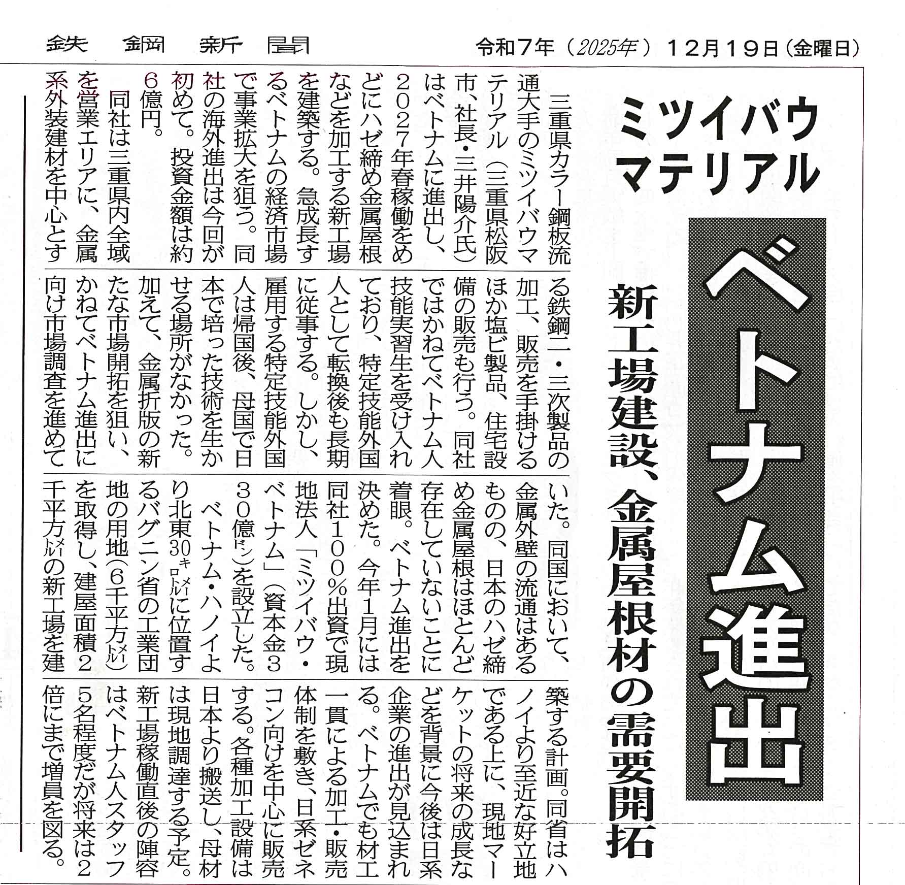2025年12月19日付の鋼鉄新聞様にて、当社ミツイバウ・マテリアルのベトナム進出および新工場建設の取り組みが紹介されました。