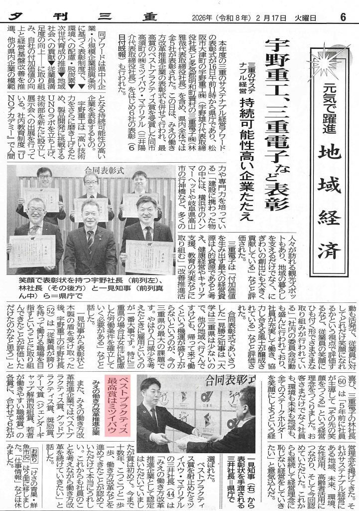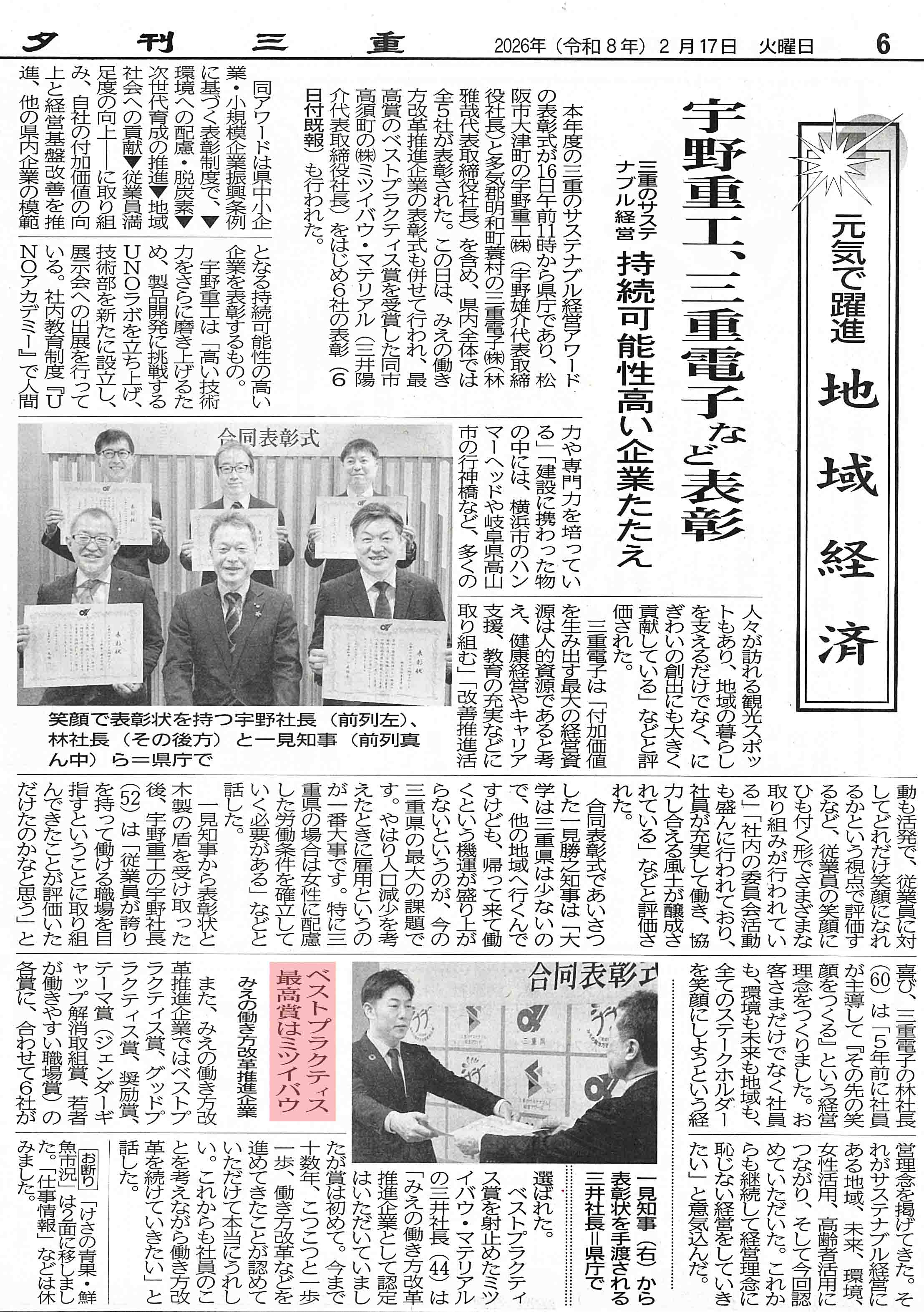 2026年2月17日付の夕刊三重新聞様にて、表彰式の様子が掲載されました。